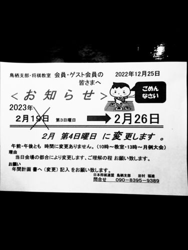 第57回福岡中央支部月例会 時 2月12日 開催 先着32名事前予約 ☆申込 09025199338 長浜まで ☆2月の月例会ですが、支部名人戦と重なる為、一週間前倒しにします。 参加お待ちしています